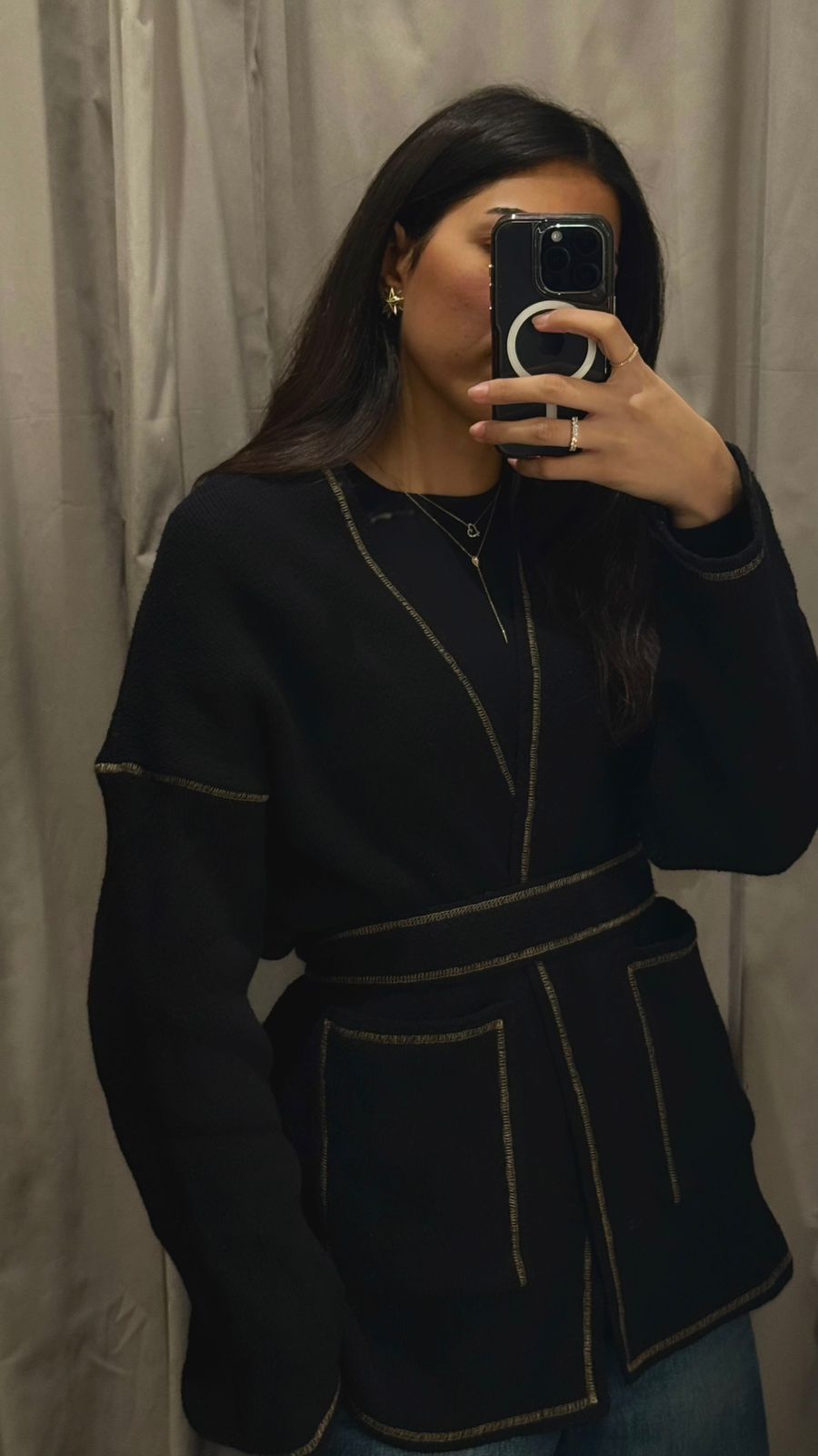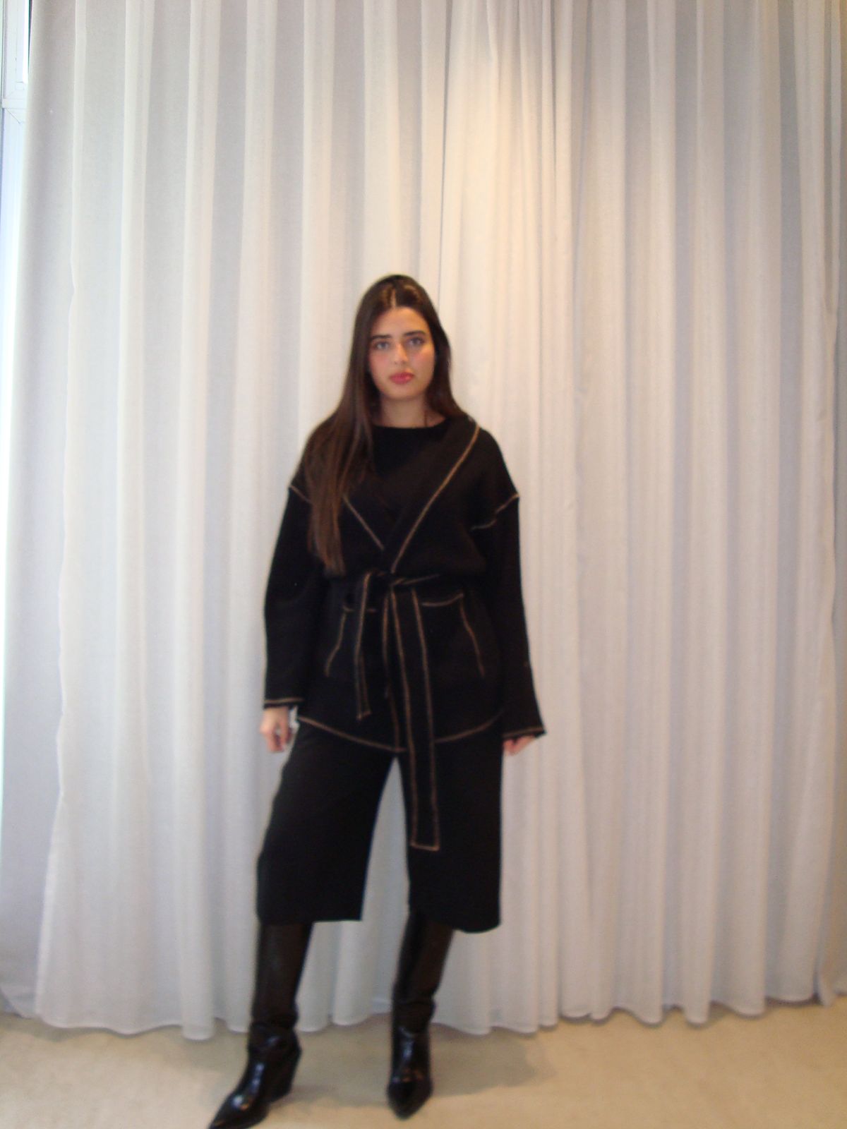 The Knitted Edged Cardigan is crafted in a soft tricot knit, designed to play with perspective. Featuring a striking contrast of beige borders against a deep black base, it utilizes clever color-blocking to create a unique 3D illusion along every edge. This mid-length statement piece is finished with classic straight-fit sleeves and a matching belt, offering a customizable look whether it is cinched for a defined waist or open for a relaxed, layered silhouette.